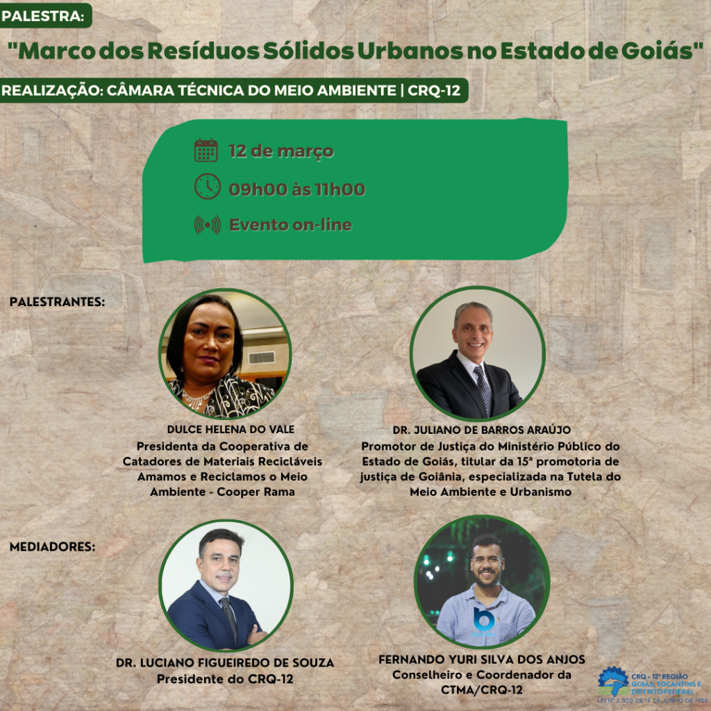 A Câmara Técnica do Meio Ambiente do CRQ-12 (CTMA/CRQ12) promoverá, no próximo dia 12 de março de 2024, palestra gratuita sobre o tema “Marco dos Resíduos Sólidos Urbanos no Estado de Goiás”.