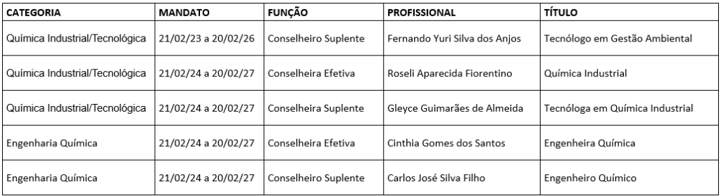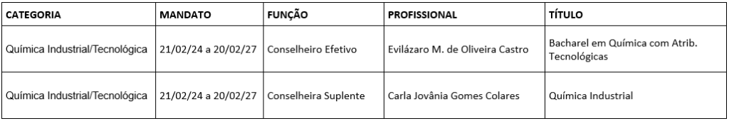 O Conselho Regional de Química XII Região (CRQ-12), na Reunião Plenária Ordinária 452, realizada em 22 de fevereiro de 2024, empossou os Conselheiros eleitos nas Assembleias de Delegados-Eleitores, ocorridas em 15 de fevereiro de 2024, representando os grupos: