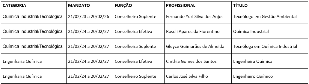 O Conselho Regional de Química XII Região (CRQ-12), na Reunião Plenária Ordinária 452, realizada em 22 de fevereiro de 2024, empossou os Conselheiros eleitos nas Assembleias de Delegados-Eleitores, ocorridas em 15 de fevereiro de 2024, representando os grupos: