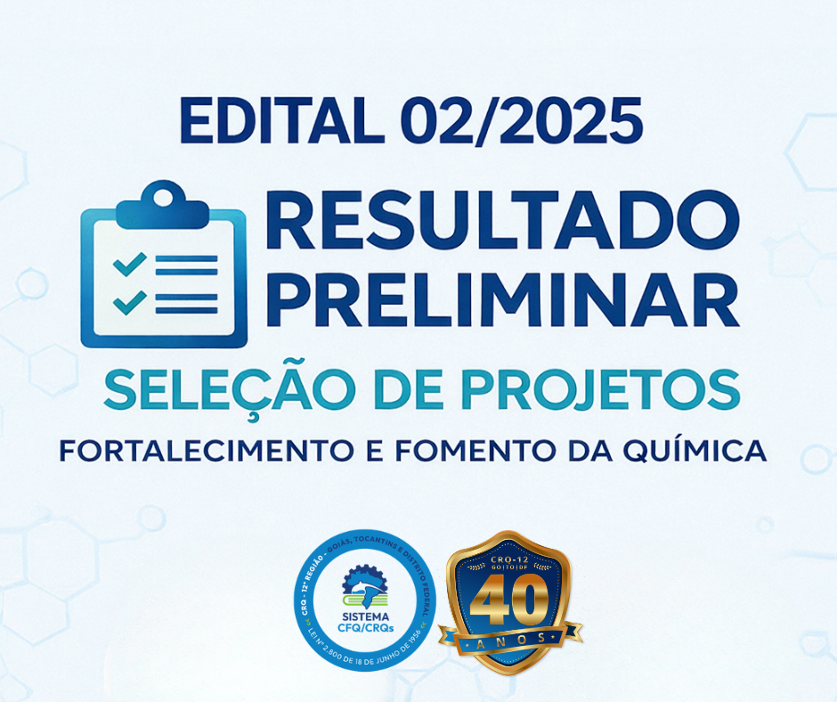 Como previsto no Edital de Chamamento Público nº 02/2025, foi publicado o Resultado Preliminar da seleção de propostas de auxílio financeiro e patrocínio para projetos que promovam o fortalecimento e o fomento da Química e de suas práticas na área de jurisdição do CRQ-12 (Goiás, Tocantins e Distrito Federal).