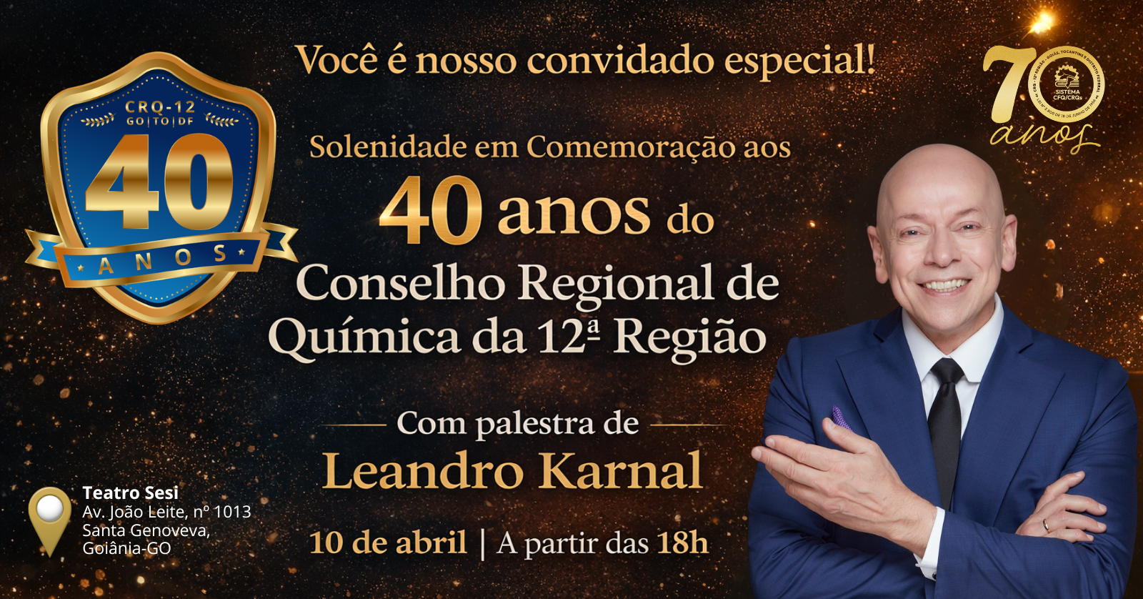 O Conselho Regional de Química da 12ª Região (CRQ-12) convida para a solenidade em comemoração aos seus 40 anos de atuação, um marco que celebra quatro décadas de história, conquistas e relevantes contribuições à sociedade.