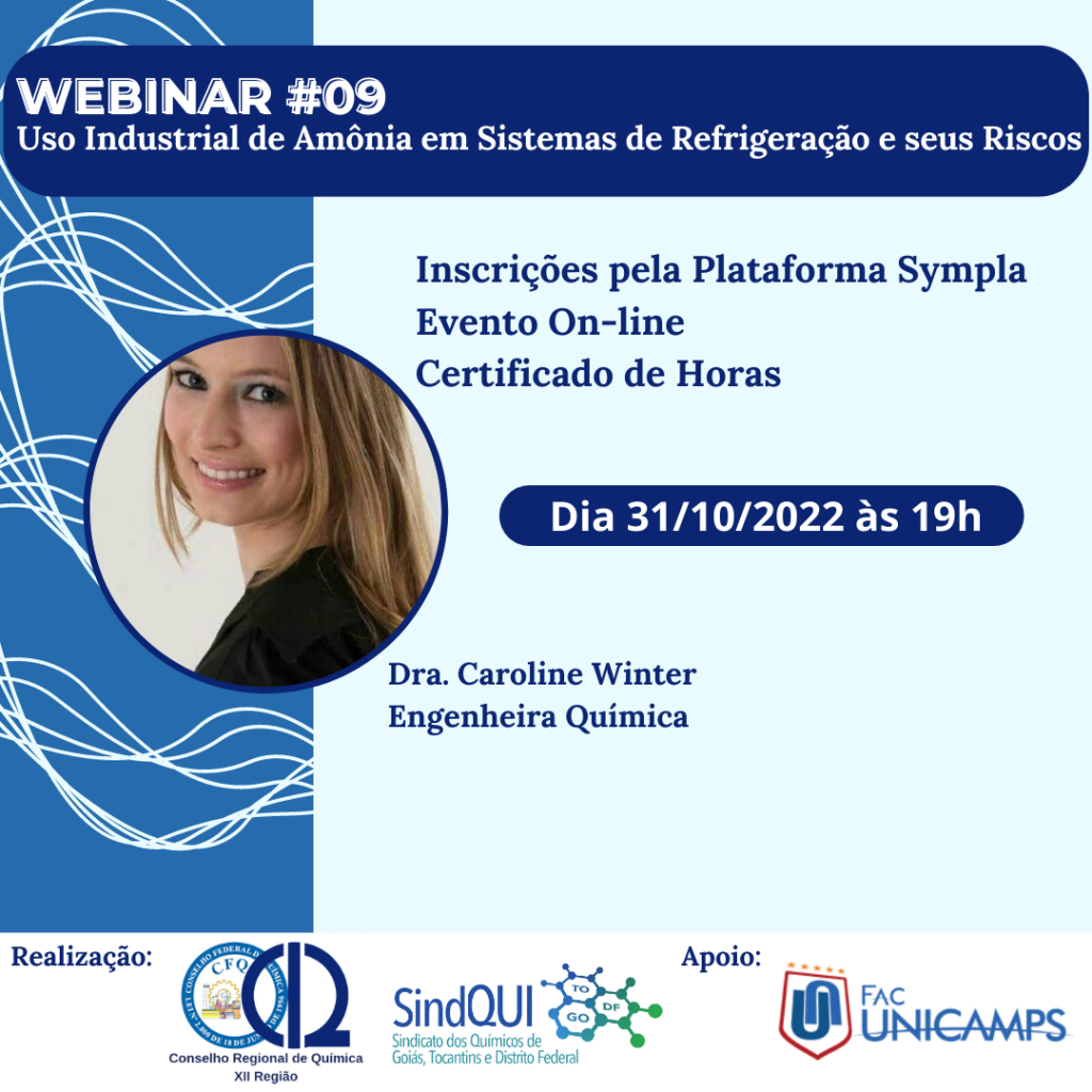 Finalizando o mês de outubro, teremos no dia 31, próxima segunda-feira, às 19 horas, o Webinar #09. Com o tema “Uso Industrial de Amônia em Sistemas de Refrigeração e seus Riscos”, a Engenheira Química Dra. Caroline Winter irá falar sobre o composto químico que vem ganhando notoriedade diante dos últimos acidentes de vazamento de amônia em indústrias no estado de Goiás.